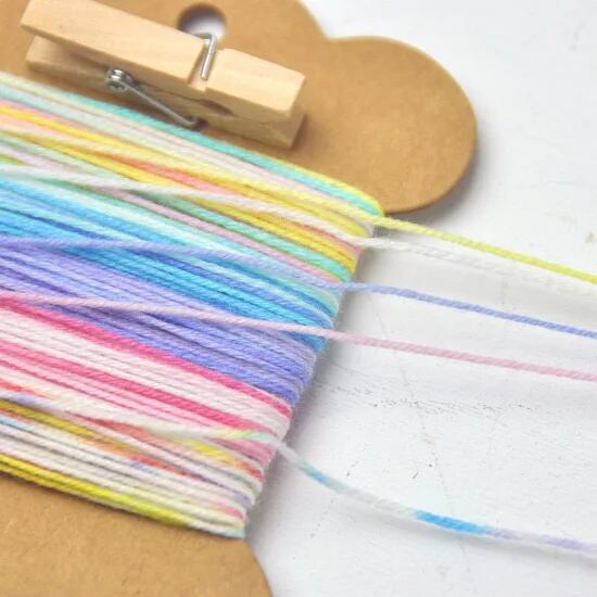 ●紙製スプールに巻いたメリノ紡績糸は全て多色のムラ染めです。5色セットになっており、各色2個は作れる分量です。