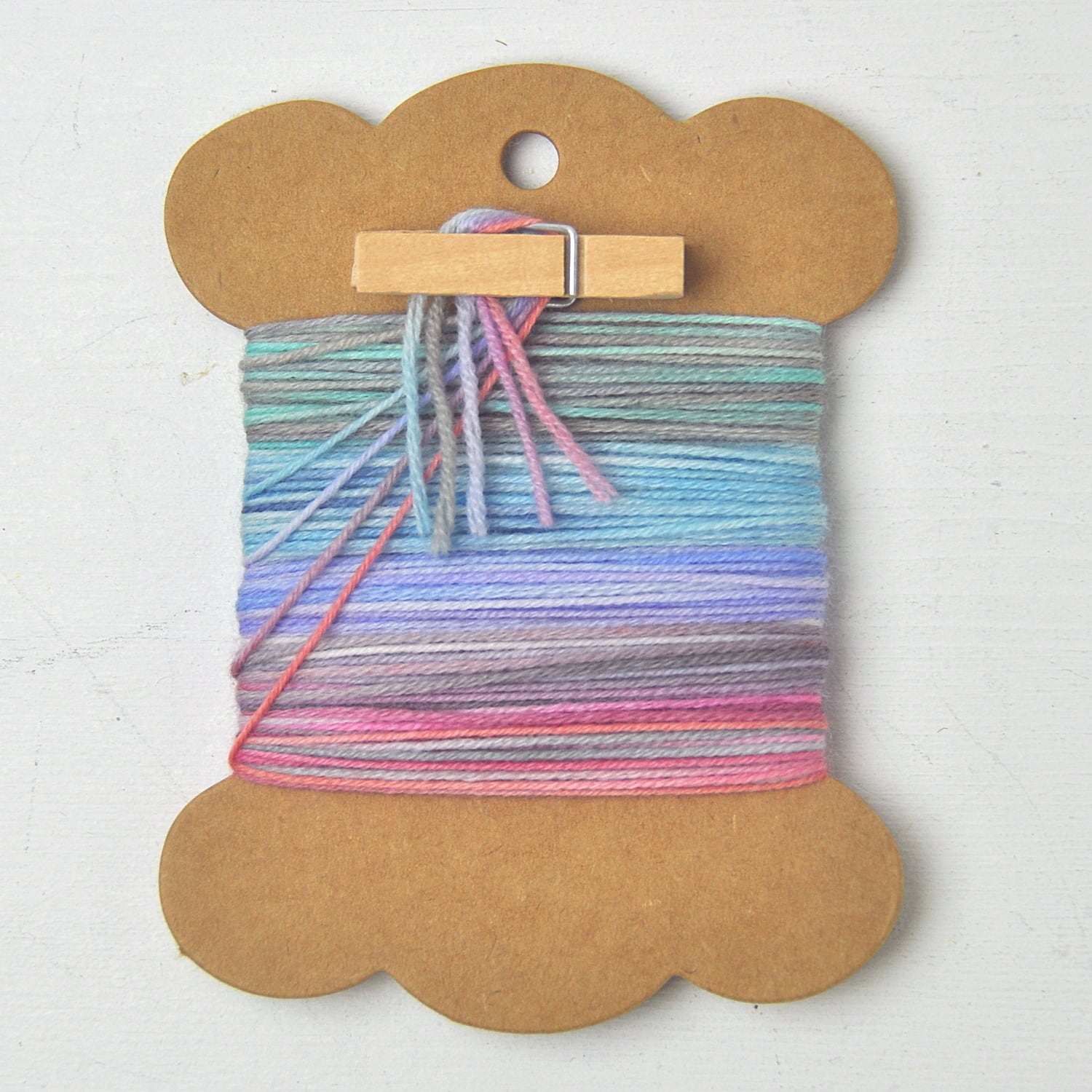 ●紙製スプールに巻いたメリノ紡績糸は全て多色のムラ染めです。5色セットになっており、各色2個は作れる分量です。