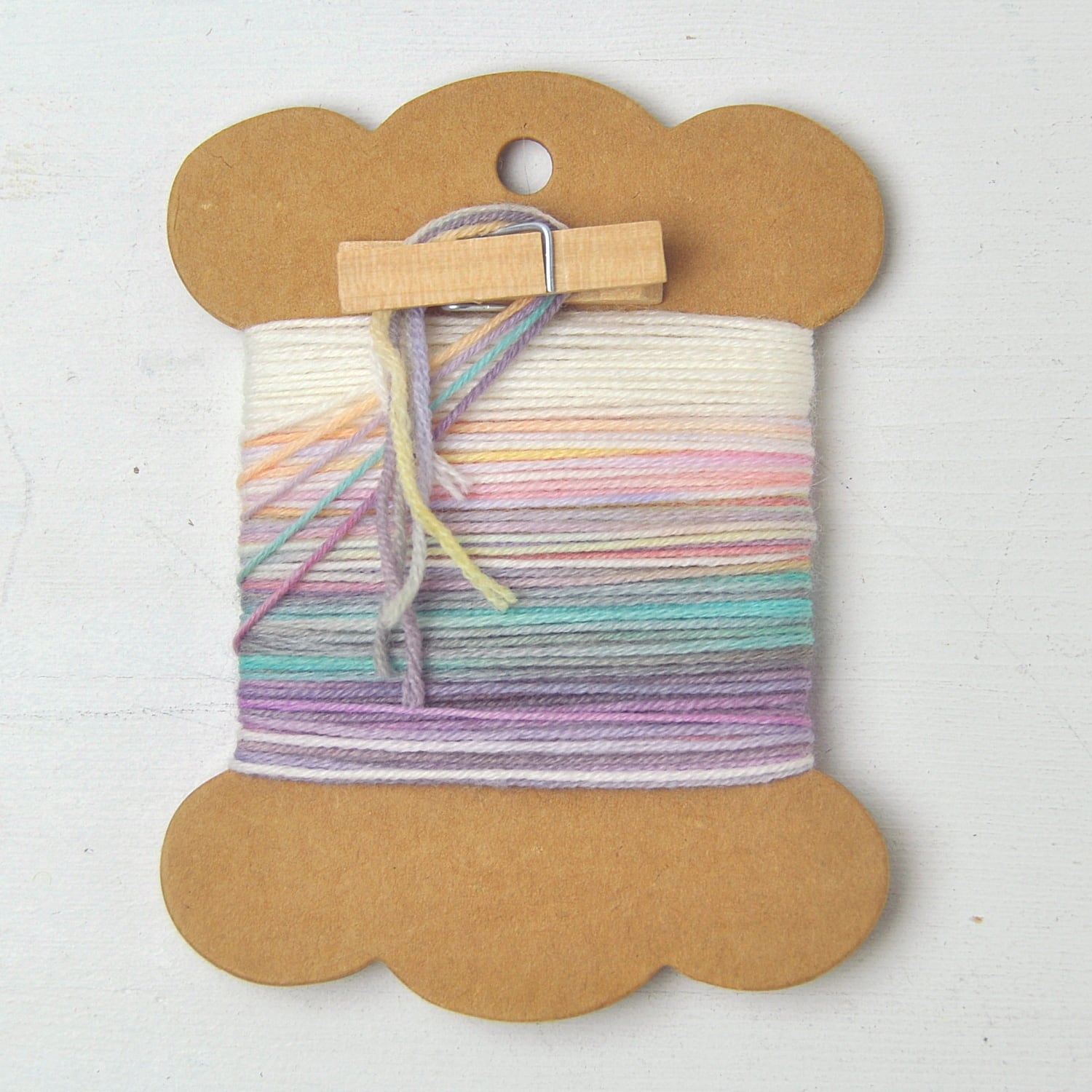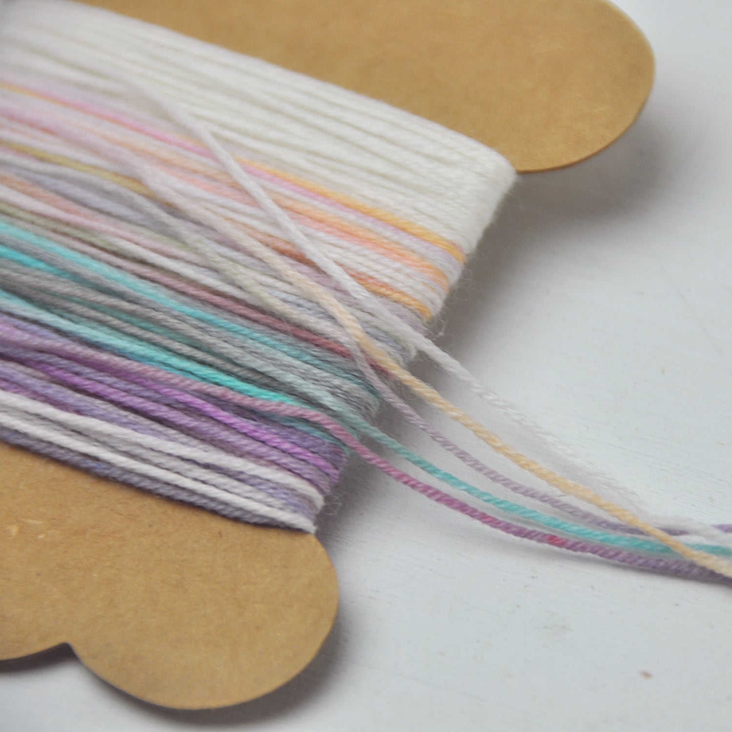 ●紙製スプールに巻いたメリノ紡績糸は全て多色のムラ染めです。5色セットになっており、各色2個は作れる分量です。