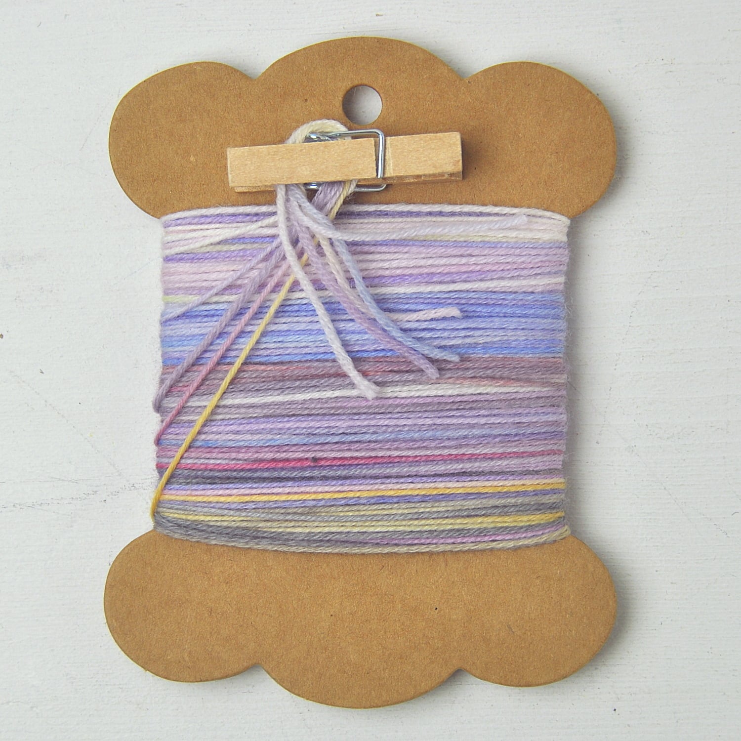 ●紙製スプールに巻いたメリノ紡績糸は全て多色のムラ染めです。5色セットになっており、各色2個は作れる分量です。