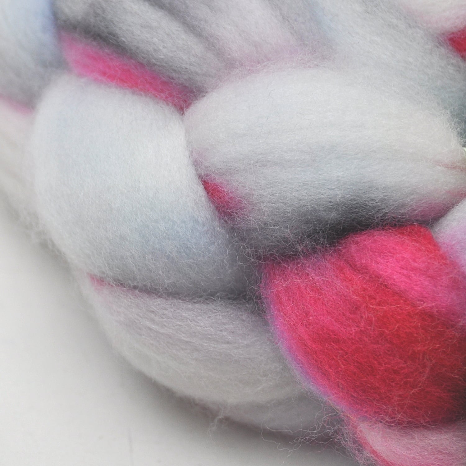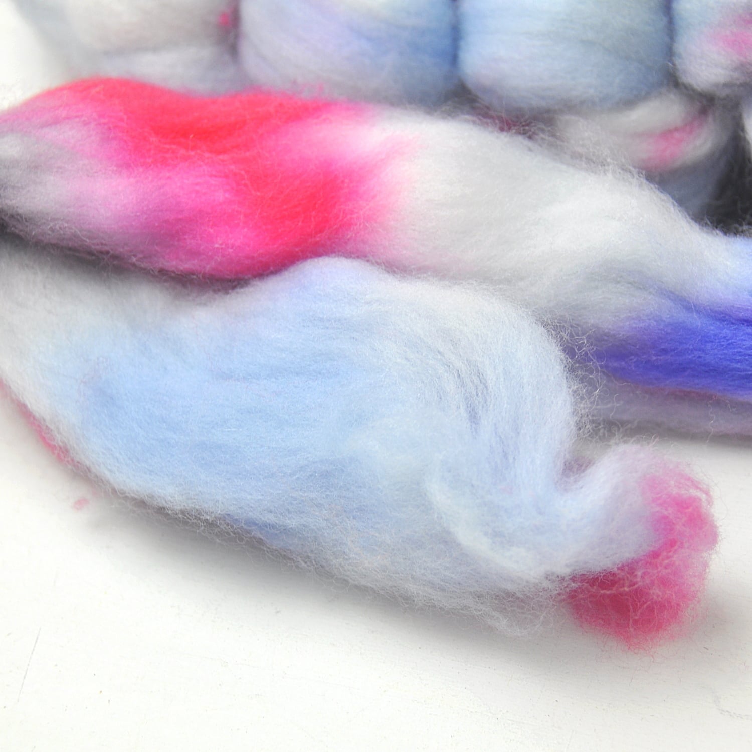 表面が滑らかで繊維同士が絡み合いにくいので引き出しやすく、とても気持ちよく紡げるウールトップです。